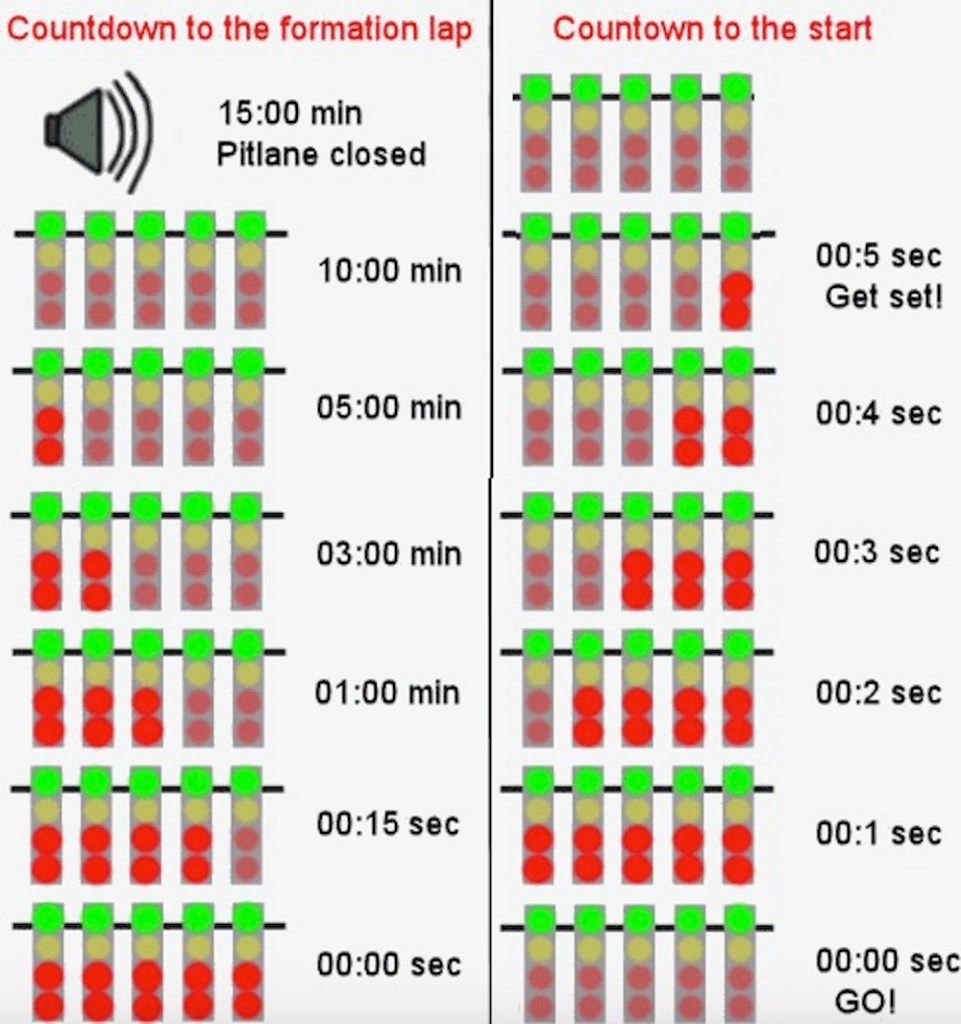 But traffic lights are not only consisting of various colors, there are also different ways to arrange them, further to the traditional top-down placement of red-yellow-green, that make them more intuitive to understand. One such arrangement is being used in the start of a Formula 1 race: