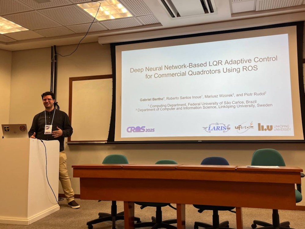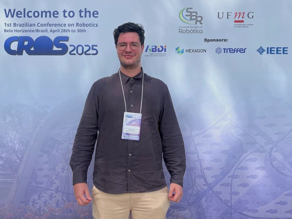 Another highlight this month is related to my student of the Swedish language, Gabriel Bertho. I teach him Swedish so he can communicate well with his fellow colleagues at Linköping University of Technology. Gabriel, who is a technology student at UFSCar, the Federal University of São Carlos, spent four months in Sweden in 2024 on a robotics project. The result of that project was presented by him at the 1st Brazilian Conference on Robotics in Belo Horizonte, MG, Brazil during the last three days of April, 2025. Here are two pictures of Gabriel and his presentation at the conference: