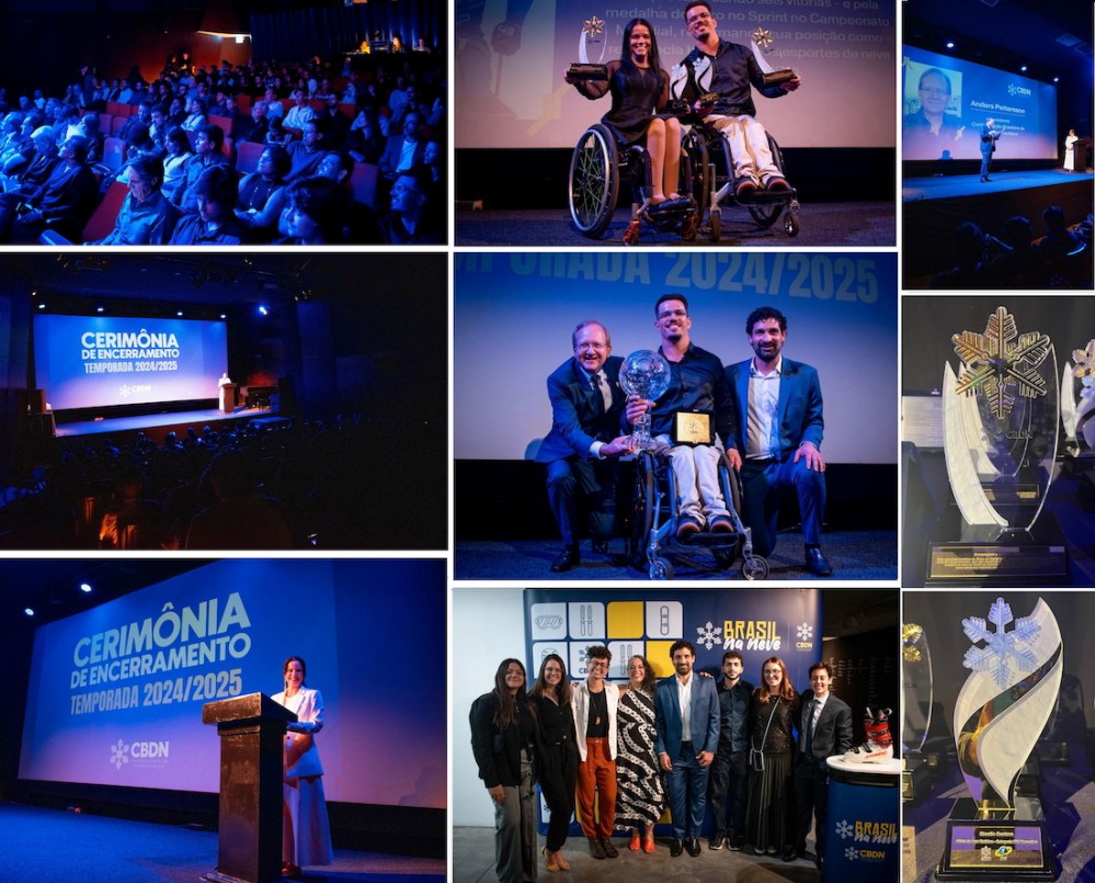 As you can see from the photo in the upper left corner, the auditorium was packed with expectation from the athletes, their families, friends and supporters. The bottom photo in the left column shows the ceremony master, Beth Romero. The three photos in the middle column show, from top to bottom: – Two of the most rewarded athletes, Aline Rocha and Cristian Ribera, both world champions in para ski cross country; – Cristian Ribera, showing the Crystal Globe as World Cup champion, rewarded as Athlete of the Season, flanked by CBDN President Anders Pettersson and COO Gustavo Haidar; – Some of the CBDN staff present during the ceremony, from left to right: Laura Dias, Luisa Crisol, Luíza Calaça, Thatiana Freire, Gustavo Haidar, Matheus Sales, Laura Costa, and Rafaella Malafaia. In the rightmost column, from top to bottom: – CBDN President Anders Pettersson welcoming the audience to the cremony; – The trophy awarded to the Athletes of the Year in their respective disciplines; – The trophy awarded to the Athletes considered Revelations or Highlights during the Year.