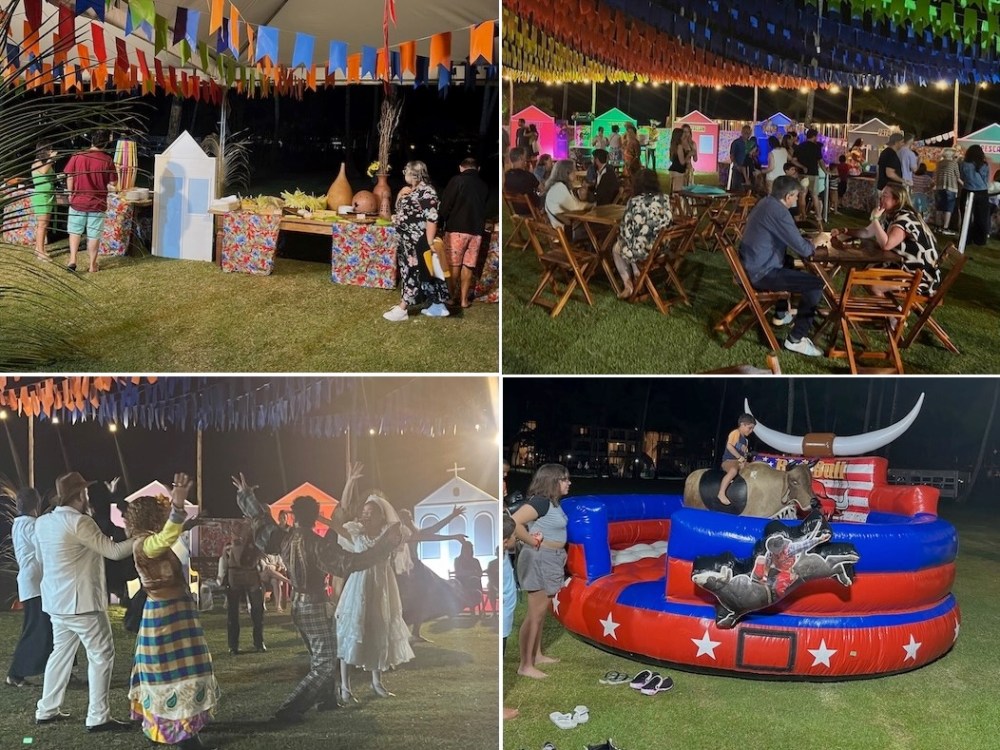 Pictures taken at the Festa junina at Transamerica in Comandatuba on 169’2025 (2025-06-19), showing a typical “arraial” with food, drinks, theater performance and even an attraction where the corageous young and old could try to master the mechanical bull.