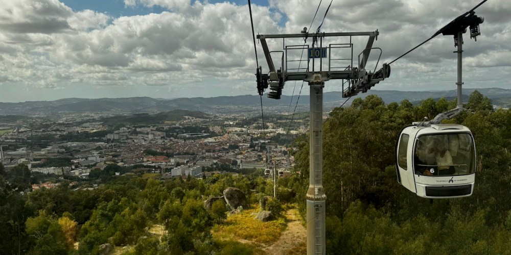 Cable car in the região of Guimarães, North of Portugal, going from the city up into the mountians. Photo taken by Dina Giltinan in August, 2025.Forest with granite rocks in the region of Guimarães, North of Portugal. Photos taken by Dina Giltinan in August, 2025.