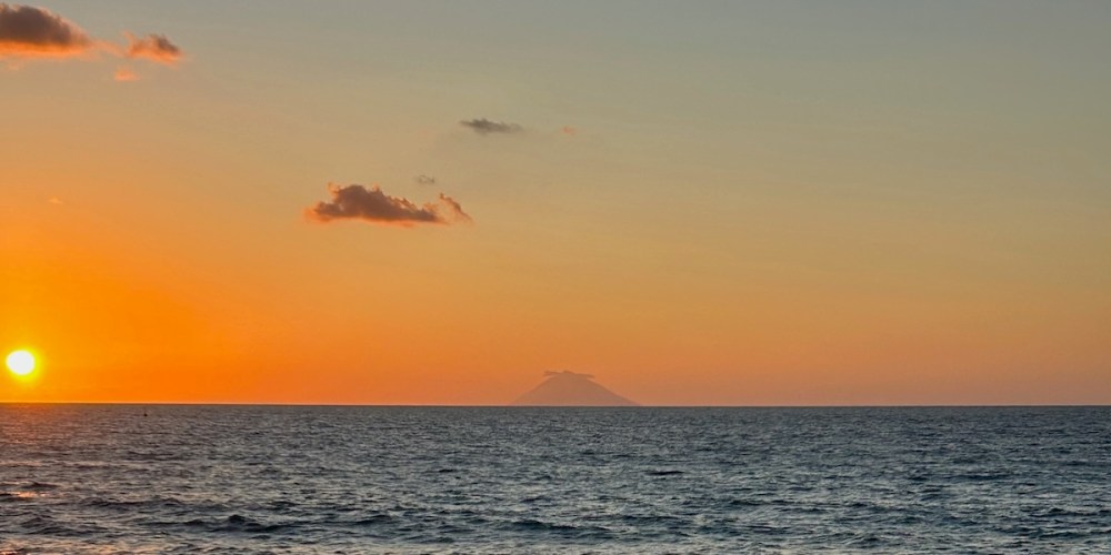 The sun setting on the Mediterranean Sea with the Stromboli volcano shown in the horizon. Photo taken on 257’2025 (2025-09-14).The sun has already set on the Mediterranean Sea with the Stromboli volcano shown in the horizon. Photo taken on 257’2025 (2025-09-14).
