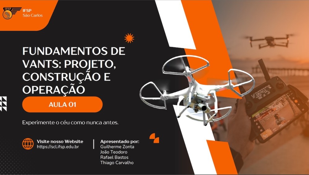 This is the title page of the first class in the series about Drones in action: project, development and deployment. The course is presented by four enthusiastic persons (Guilherme Zonta, João Teodoro, Rafael Bastos, and Thiago Carvalho) from Instituto Federal de São Paulo in São Carlos, and is coordinated by Rogéria Kapp from Fundação Educacional São Carlos.