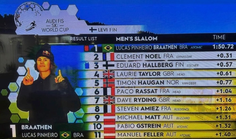 Lucas Braathen celebrating his first World Cup victory for Brazil in Levi, Finland on 320’2025 (2025-11-16). Image by ESPN. The final result of the World Cup event in slalom. Image by ESPN.
