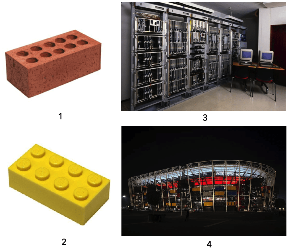 So, according to that reasoning, only 3) and 4) can be thought of as modular. Furthermore, the correct denomination for 1) and 2) is that they are components. I am sure that you all know what a brick and a Lego block are, so let us concentrate on examining 3) and 4) in bigger detail.