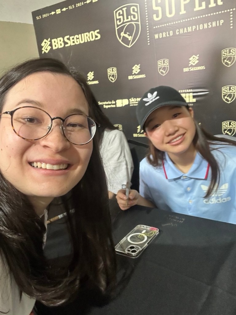 In my last post of 2023, 356’2024 (2023-12-21) , I had the pleasure of portraying myself with two Olympic gold medalists, and now the turn has come to my daughter, Karina. One week before Christmas, she went to São Paulo to assist the SLS Super Crown World Championships 2024. Among all the famous skaters present at the event, I have chosen to show her together with Momiji Nishiya, a Japanese street skatboarder who won the gold medal in the Olympic Summer Games held in Tokyo in 2021. See also reference # 1 below.
