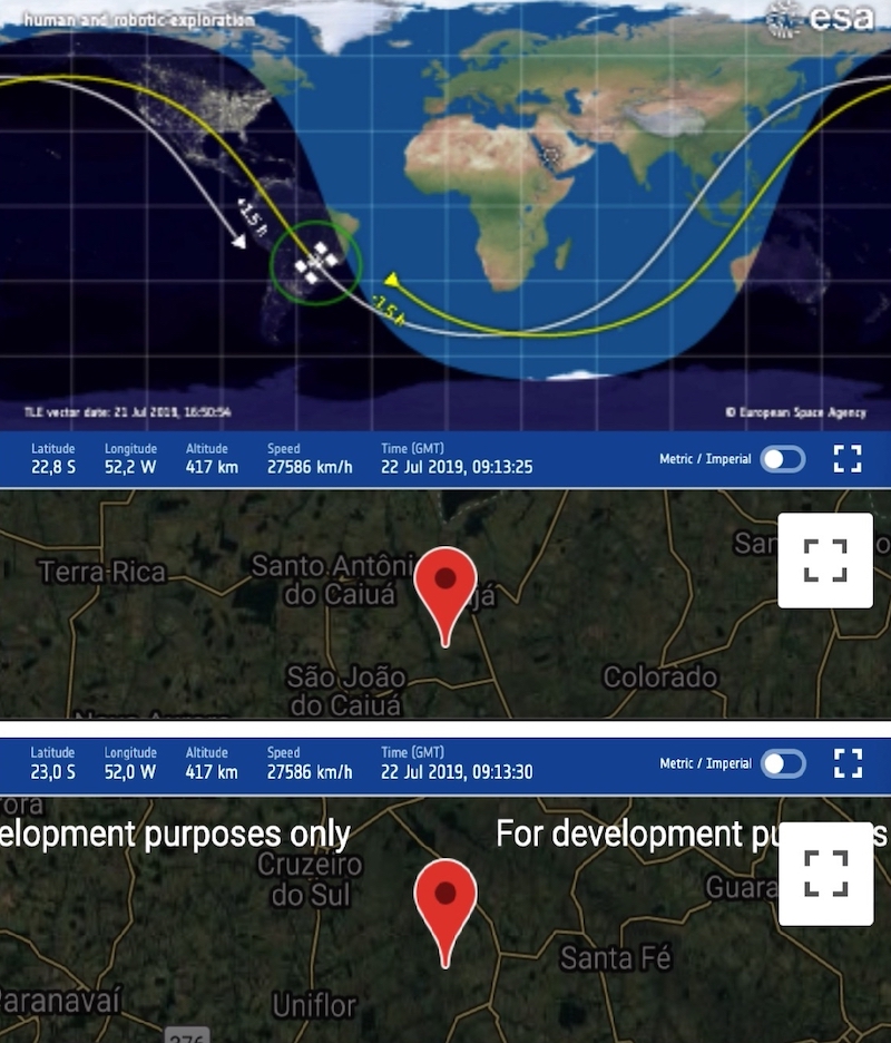 Below you can see two instances of its route, first when it was at its highest peak for our viewing, in the town of Inajá, state of Paraná, 35 km away from our location, and then after 5 more seconds, when even our town appears on the Google map below the world chart.