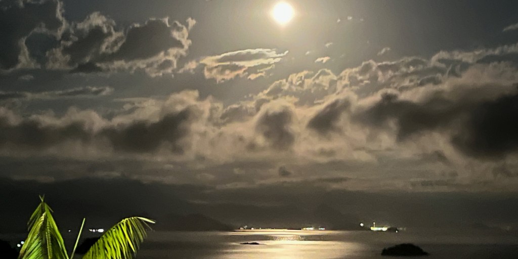 The following photo was taken on the same coast as the Santos Air Force Base, but 290 km further northeast, close to the historic city of Paraty, state of Rio de Janeiro. We had the opportunity of watching the full moon spreading its glow over the calm waters six days earlier.